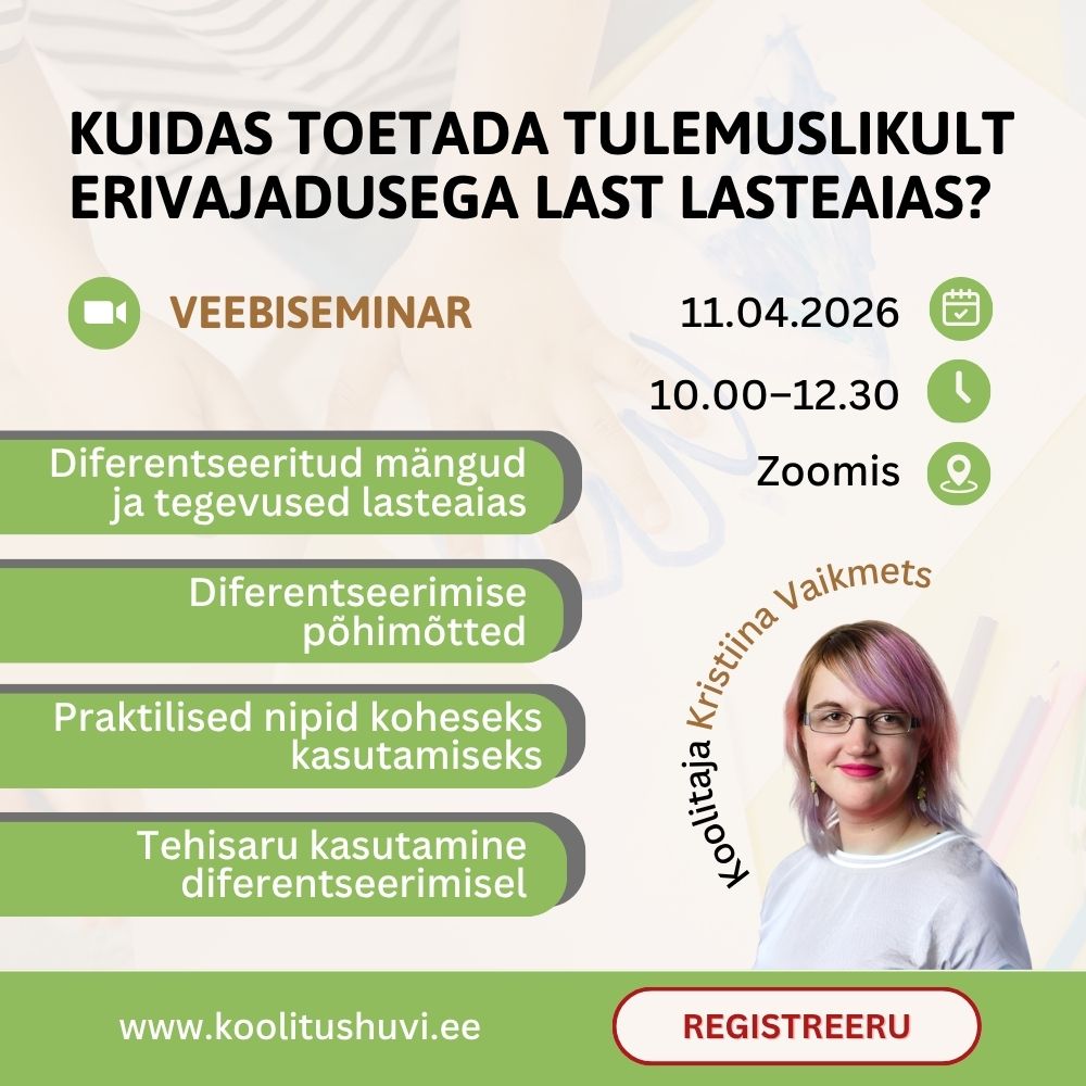 Lasteaiaõpetajate HEV koolitus. Kuidas toetada tulemuslikult erivajadusega last lasteaias? 11.04.2026. Veebikoolitus